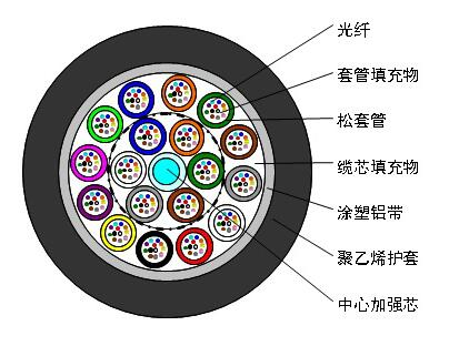 GYTA光纜的結(jié)構(gòu)是將250µm光纖套入高模量材料制成的松套管中,松套管內(nèi)填充防水化合物。纜芯的中心是一根金屬加強(qiáng)芯,對(duì)于某些芯數(shù)的光纜來(lái)說(shuō),金屬加強(qiáng)芯外還需擠上一層聚乙烯(PE)。松套管(和填充繩)圍繞中心加強(qiáng)芯絞合成緊湊和圓形的纜芯,纜芯內(nèi)的縫隙充以阻水填充物。涂塑鋁帶(APL)縱包后擠制聚乙烯護(hù)套成纜。