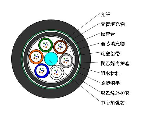 GYTA53光纜的結構是將250µm光纖套入高模量材料制成的松套管中,松套管內填充防水化合物。纜芯的中心是一根金屬加強芯,對于某些芯數的光纜來說,金屬加強芯外還需擠上一層聚乙烯(PE)。松套管(和填充繩)圍繞中心加強芯絞合成緊湊和圓形的纜芯,纜芯內的縫隙充以阻水填充物。涂塑鋁帶(APL)縱包后擠一層聚乙烯內護套,雙面涂塑鋼帶(PSP)縱包后擠制聚乙烯護套成纜。
