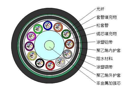 GYFTA53光纜的結構是將250µm光纖套入高模量材料制成的松套管中,松套管內填充防水化合物。纜芯的中心是一根非金屬加強芯(FRP),對于某些芯數(shù)的光纜來說,非金屬加強芯外還需擠上一層聚乙烯(PE)。松套管(和填充繩)圍繞中心加強芯絞合成緊湊和圓形的纜芯,纜芯內的縫隙充以阻水填充物。涂塑鋁帶(APL)縱包后擠上一層聚乙烯內護套,雙面涂塑鋼帶(PSP)縱包后擠制聚乙烯外護套成纜。